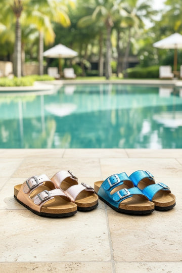 Enjoy long-lasting softness and style with these refreshing color genuine leather slides, with decorative buckles...