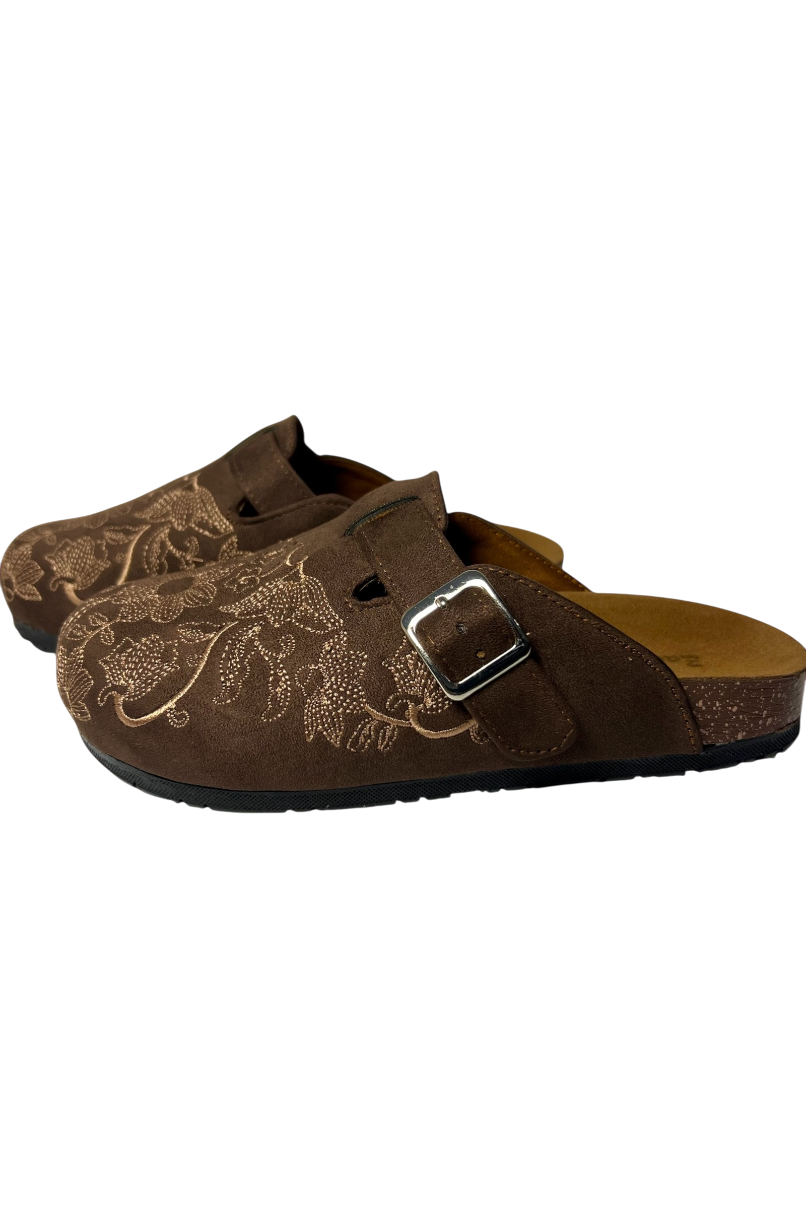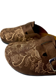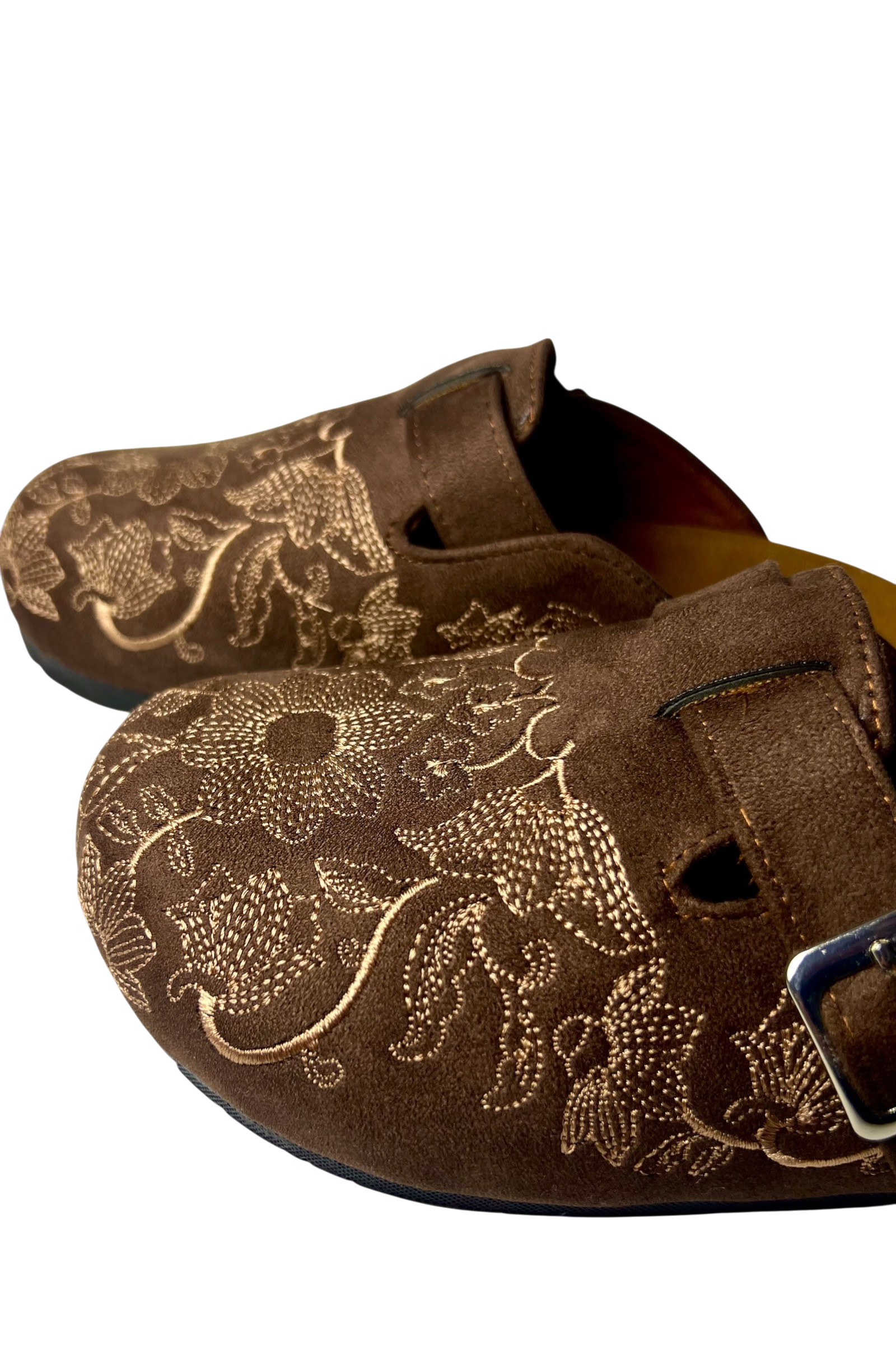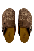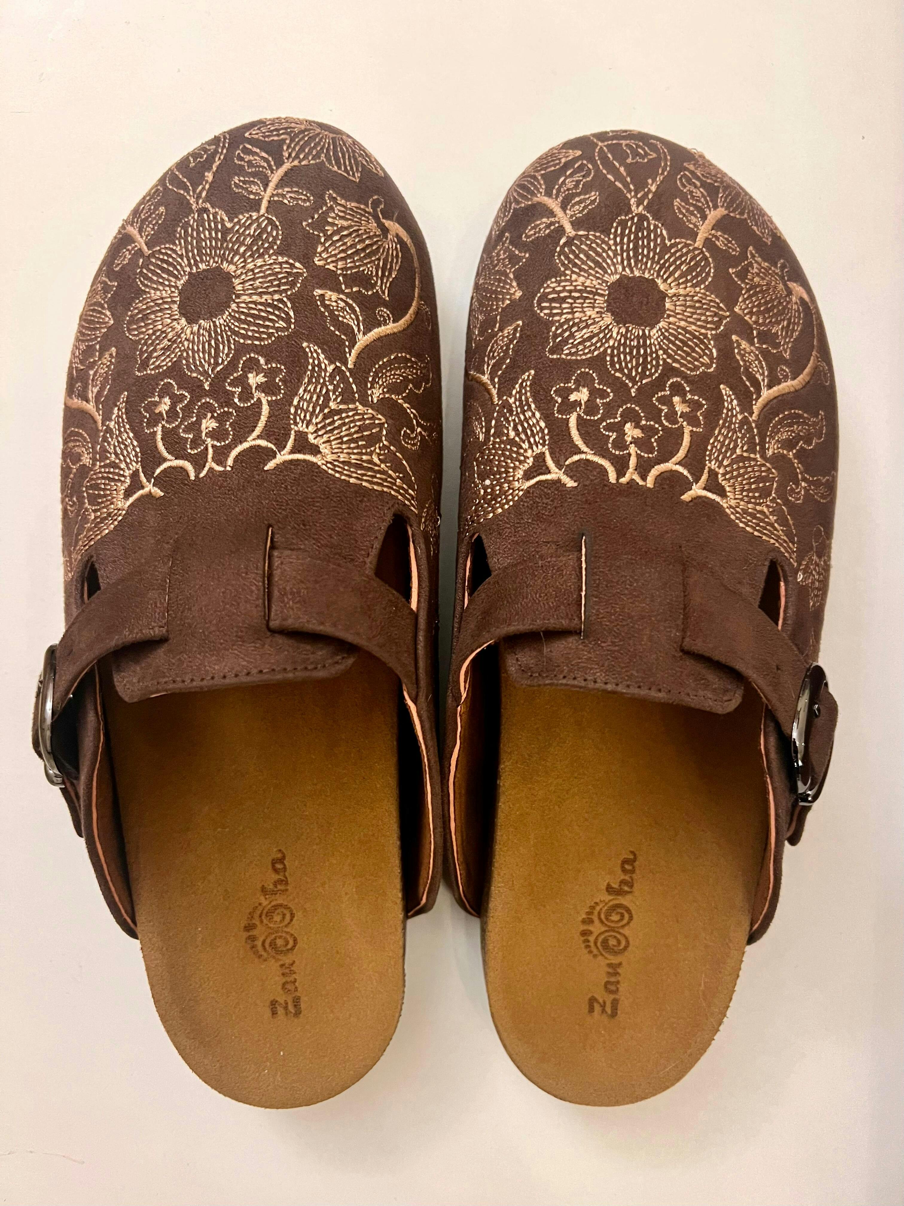 Chocolate Caramel Clogs gets you effortless elegance — where rich chocolate brown suede meets delicate caramel-toned embroidery for a look that's both sophisticated and unmistakably cozy. Each pair is adorned with intricate floral detailing that transforms a simple clog into a statement piece.