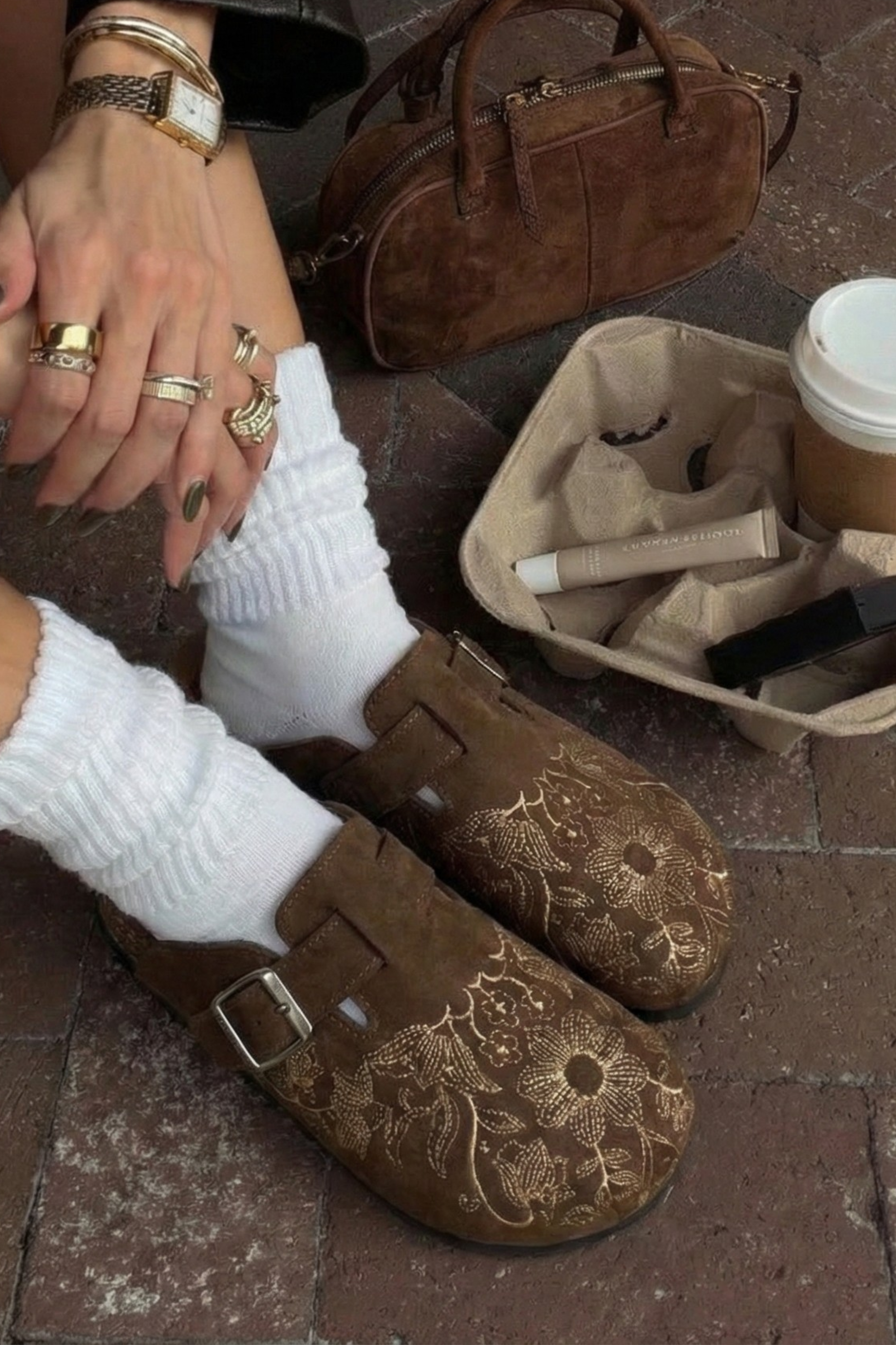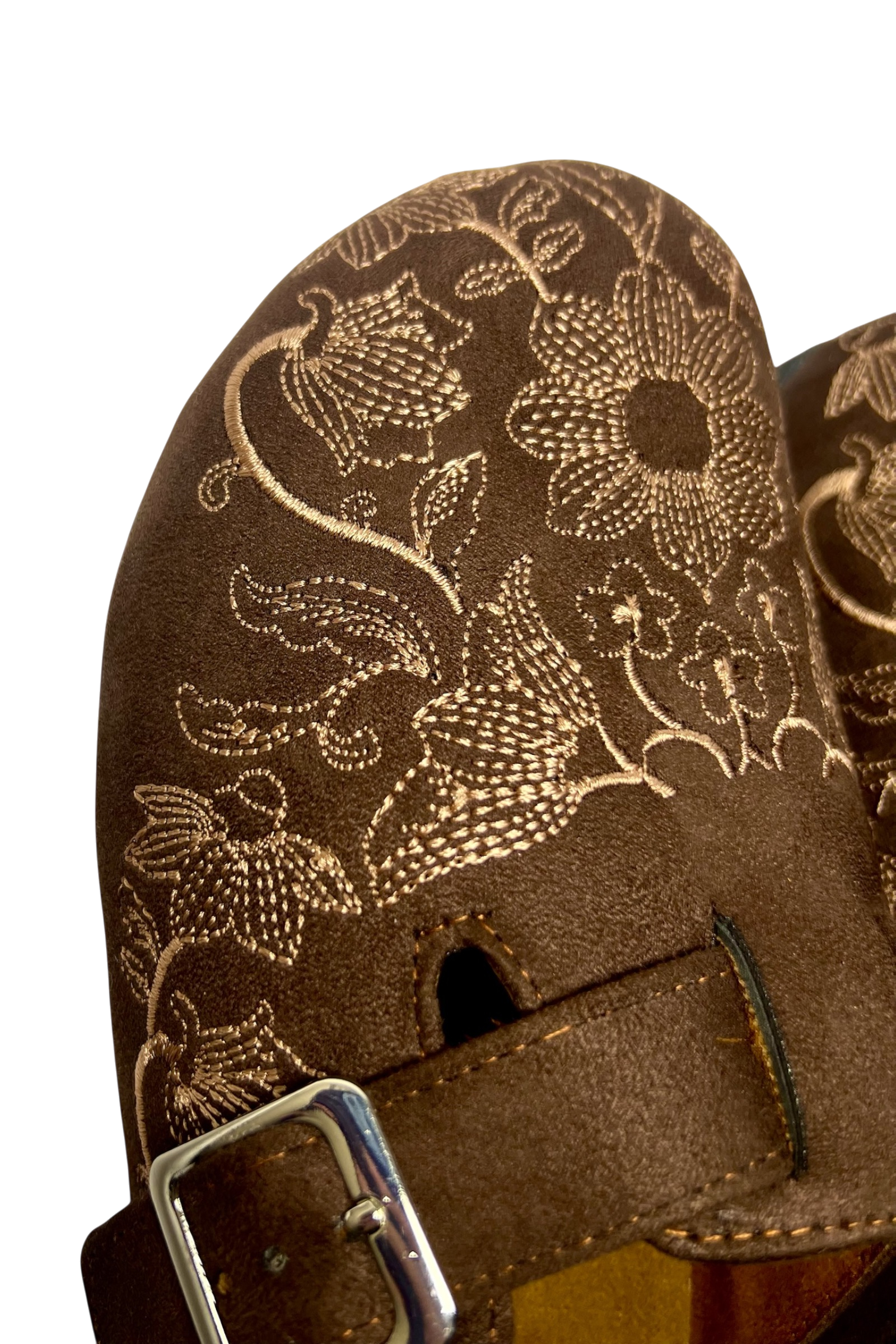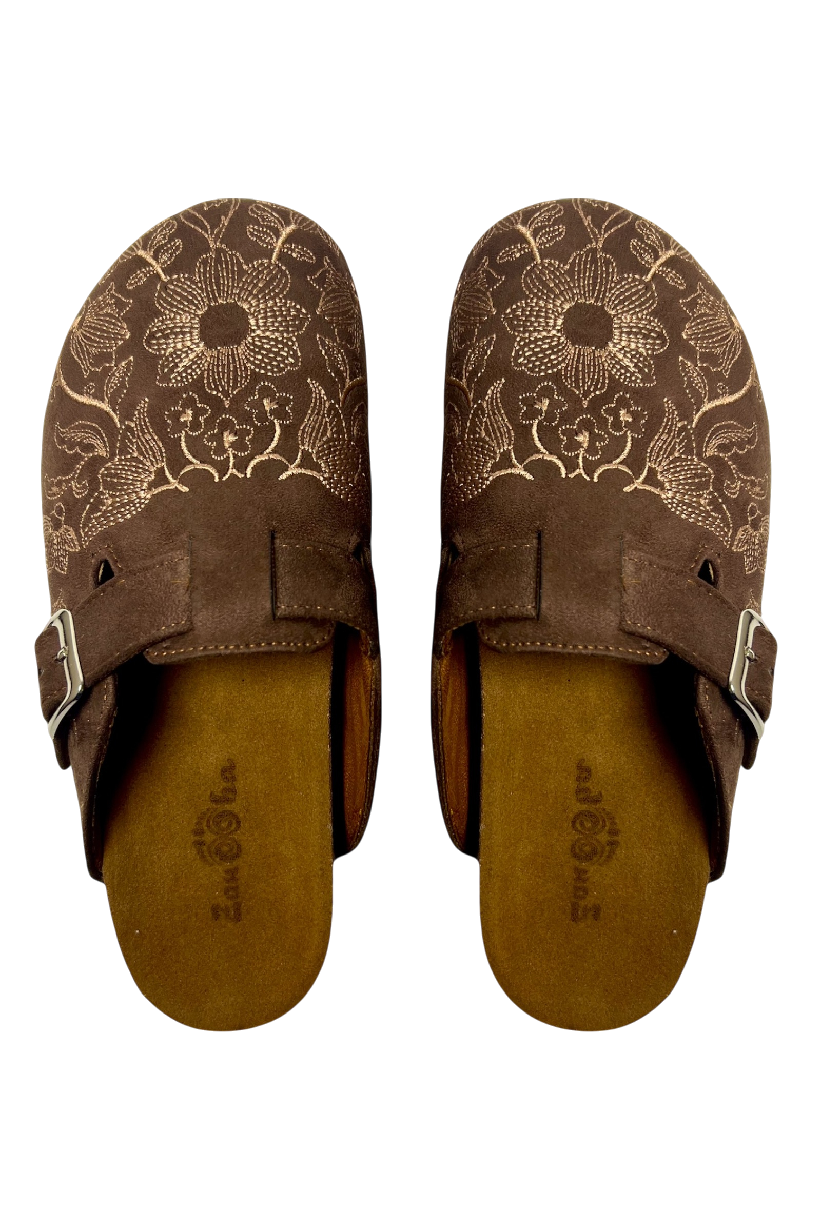Chocolate Caramel Clogs gets you effortless elegance — where rich chocolate brown suede meets delicate caramel-toned embroidery for a look that's both sophisticated and unmistakably cozy. Each pair is adorned with intricate floral detailing that transforms a simple clog into a statement piece.