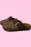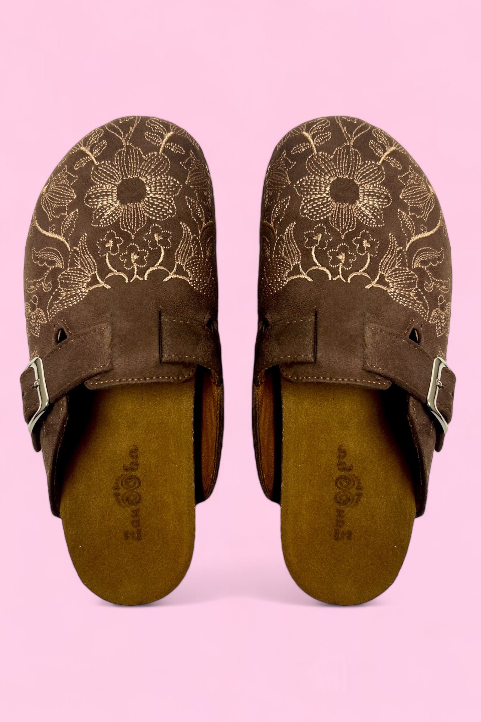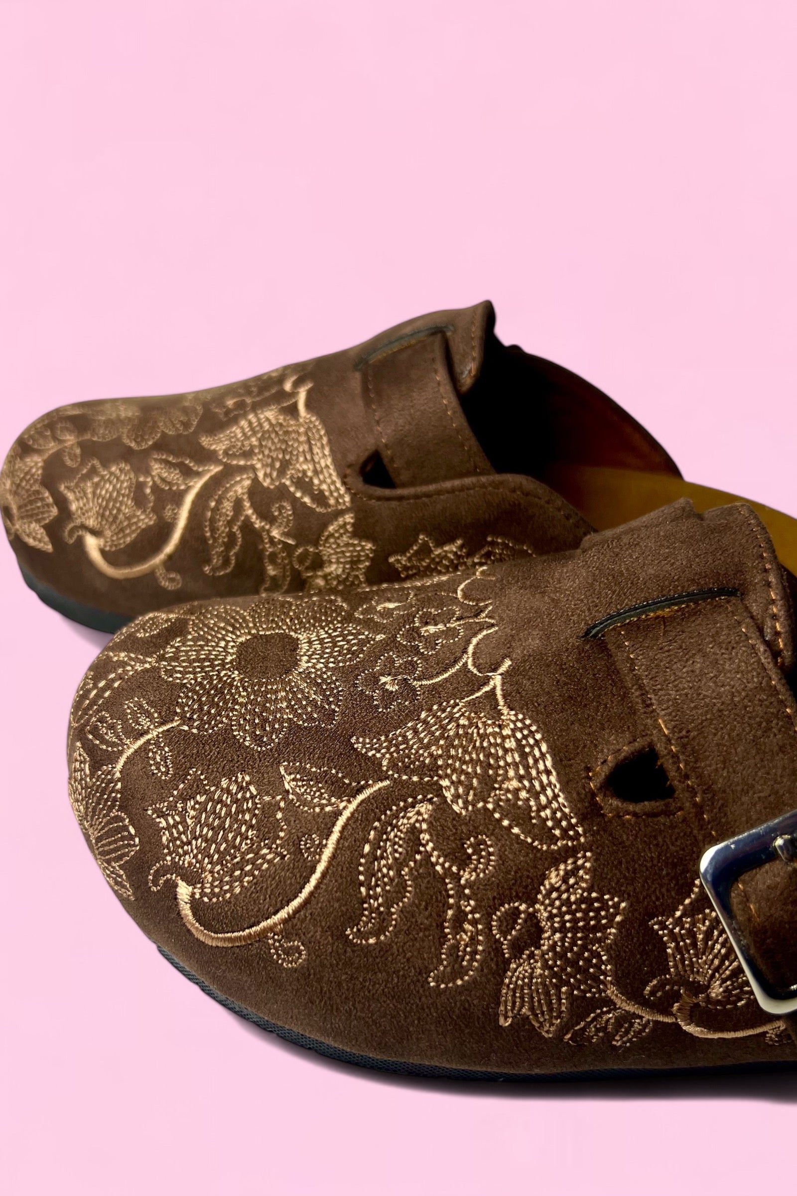 Step into elegance with our Embroidery Clogs, crafted in rich chocolate brown suede and adorned with delicate caramel-toned embroidery. Designed for both style and comfort, these clogs add a unique touch to any outfit.