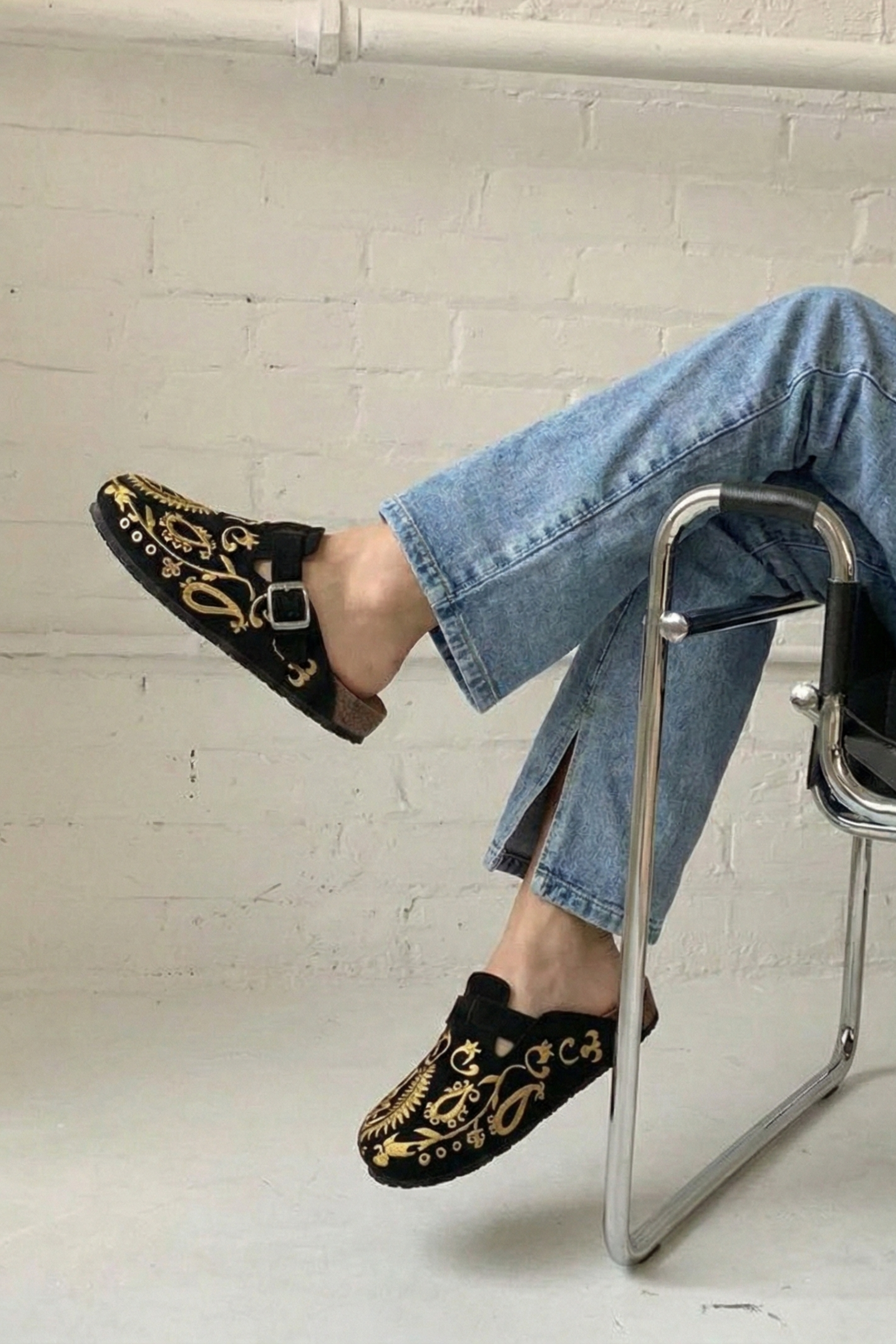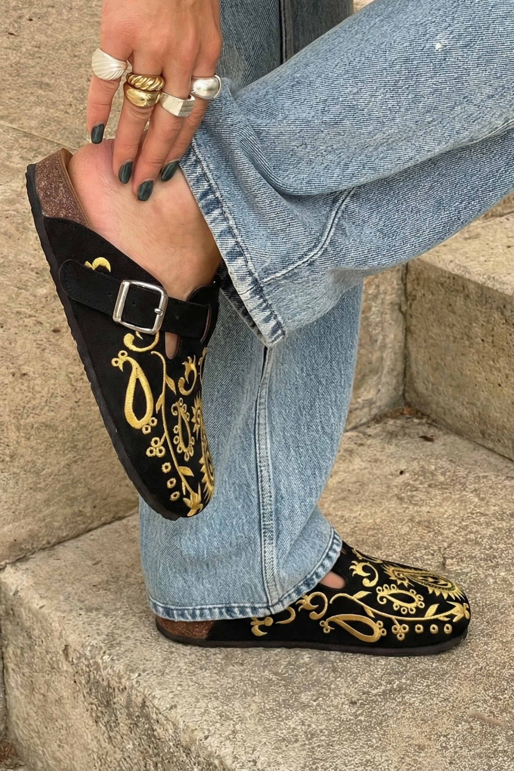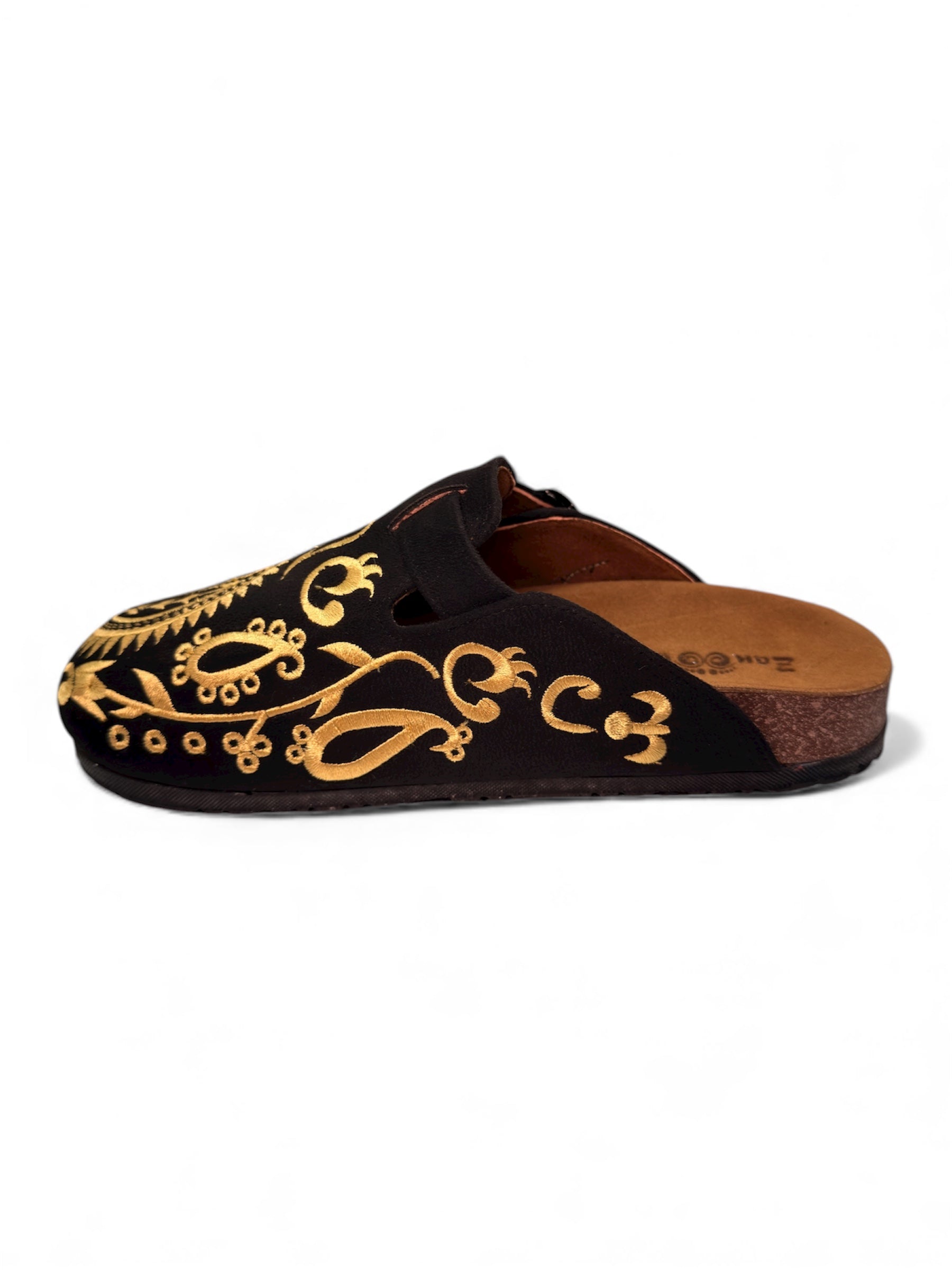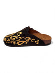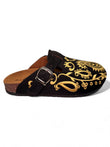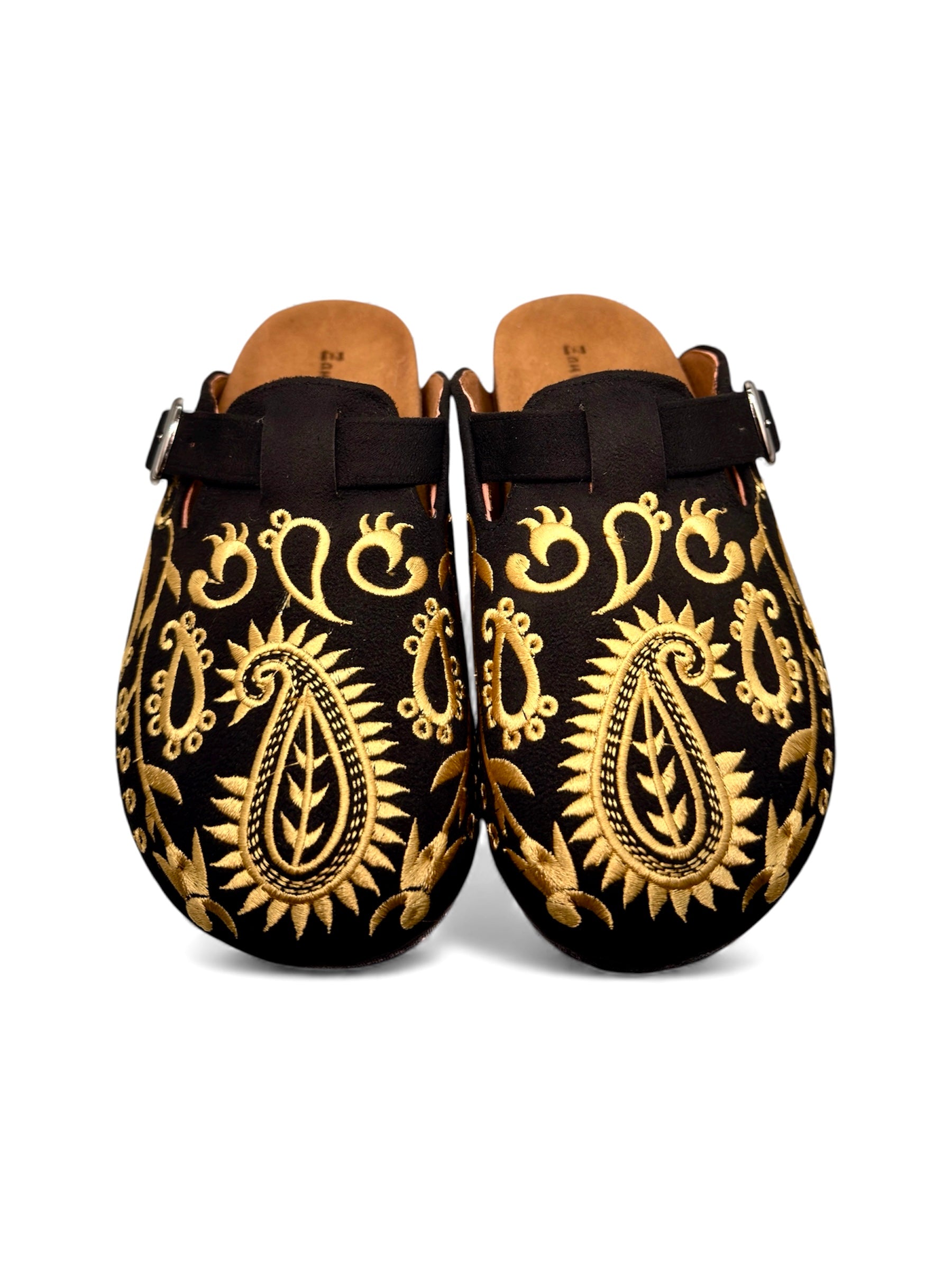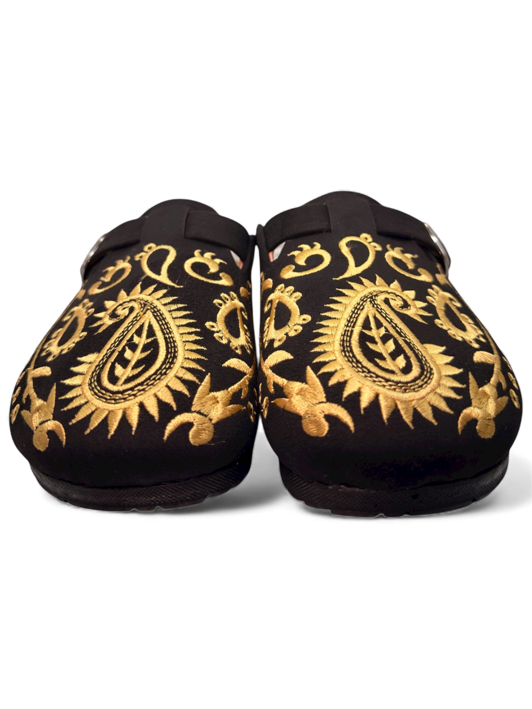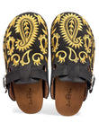 The dramatic contrast between deep black and shimmering gold creates an eye-catching effect that elevates any outfit. Each paisley motif is carefully embroidered, showcasing the attention to detail that makes these clogs feel truly special. This isn't just footwear — it's wearable art.