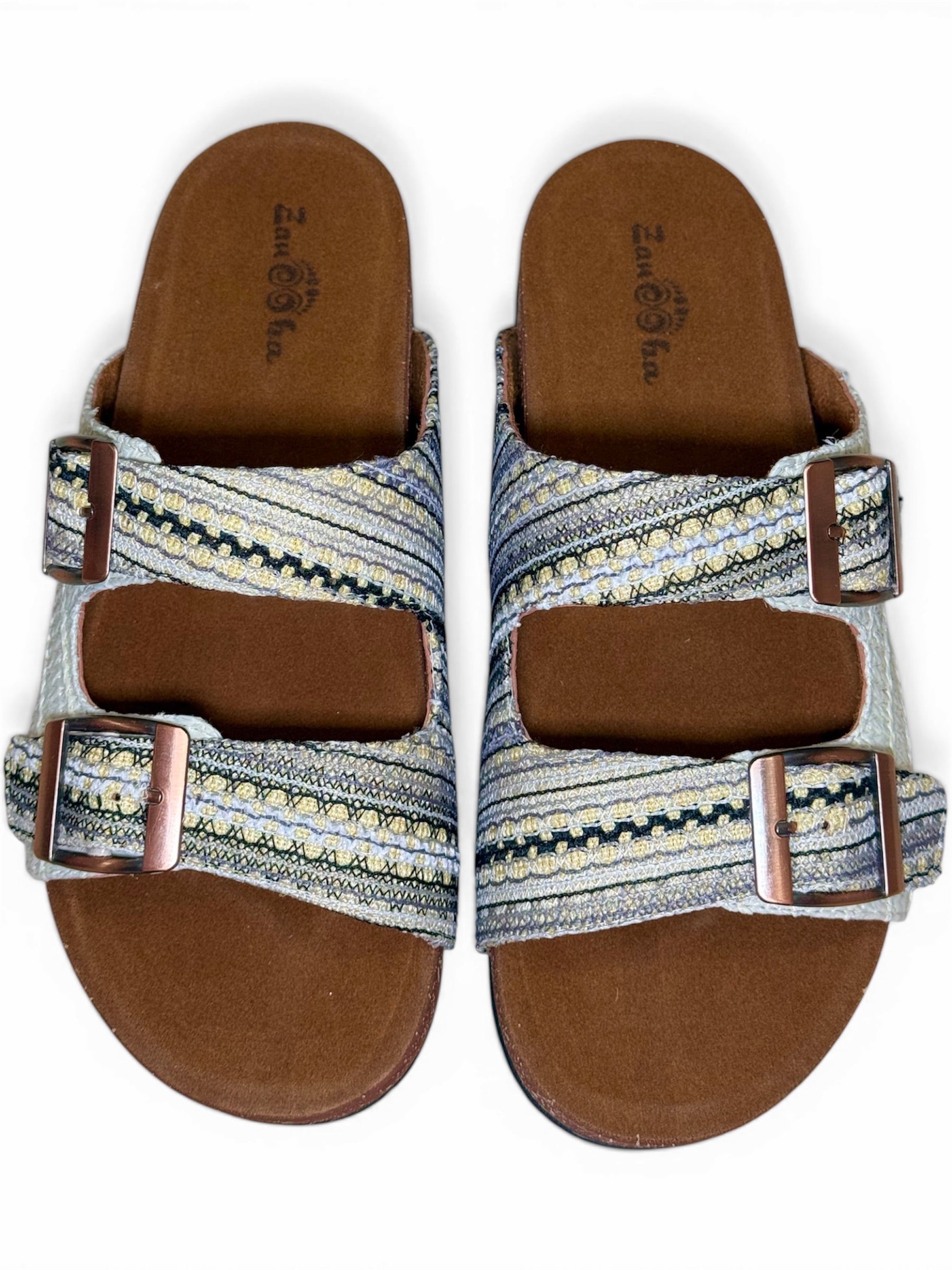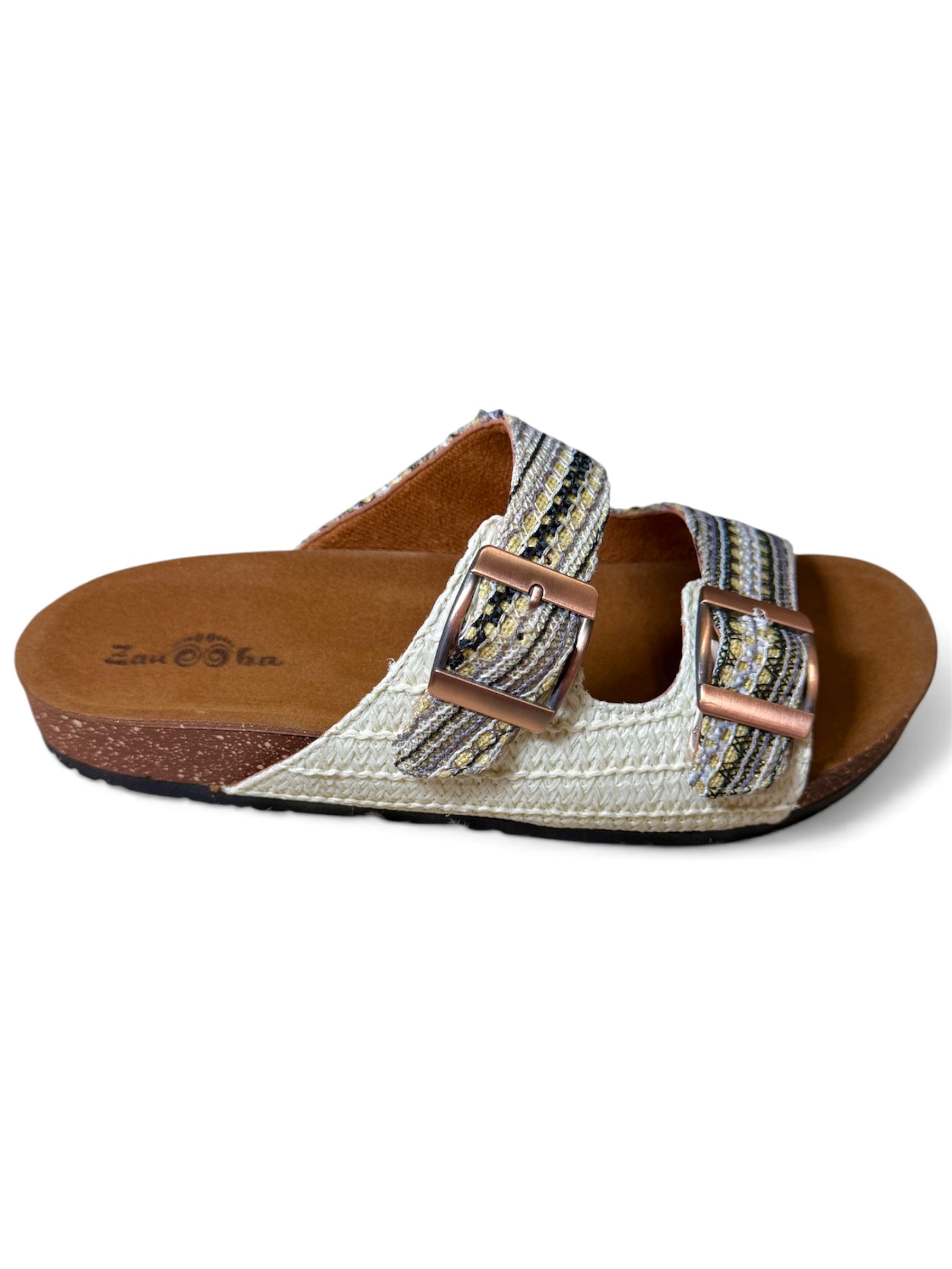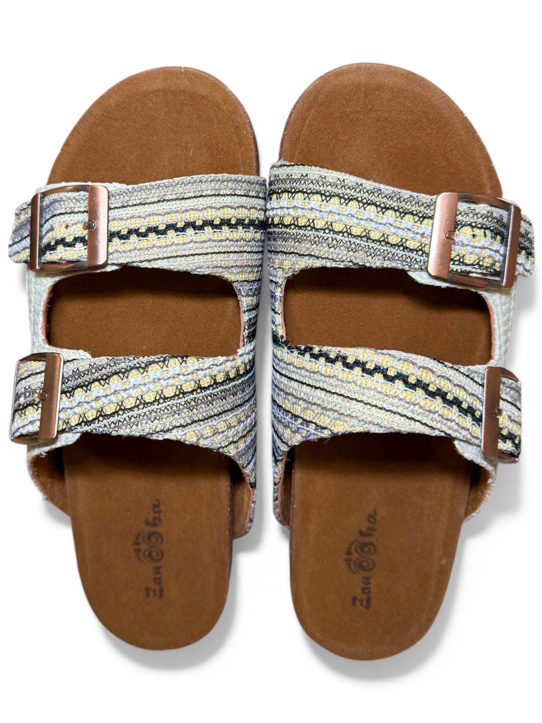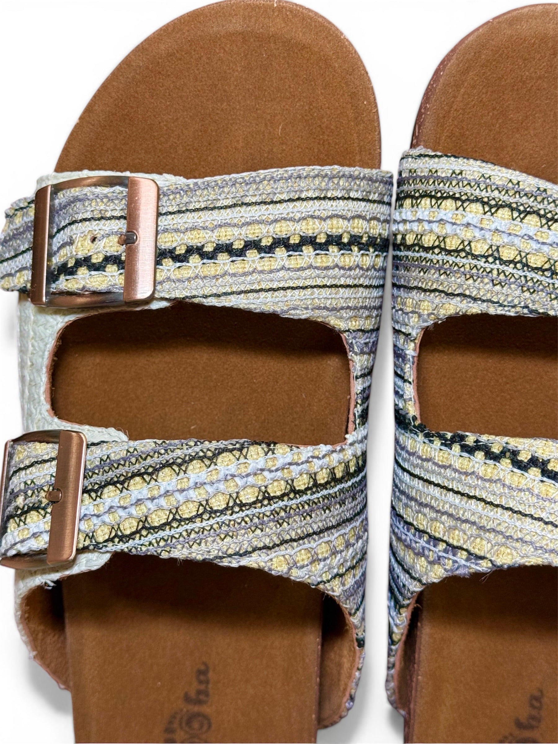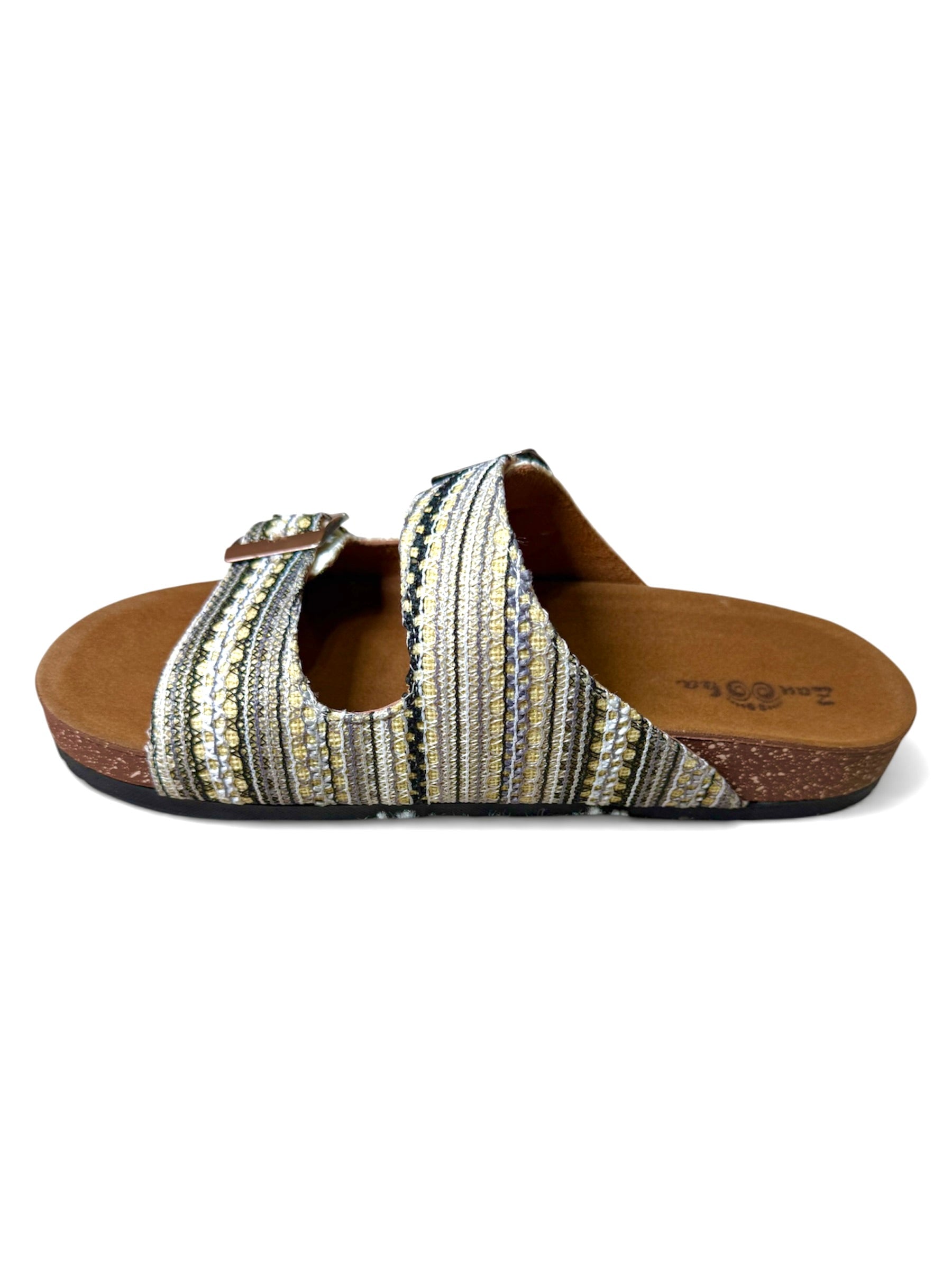 Step into effortless style with this beautifully textured slide. Featuring an intricately woven, tapestry-inspired upper, this sandal blends soft creams, warm golden-yellows, and charcoal accents for a crafted, artisanal look. The dual adjustable copper-toned buckles ensure a perfectly customized fit, while the contoured brown footbed provides all-day support. Pair them with breezy linen trousers or your favorite flowy sundress for the ultimate relaxed, bohemian vibe.